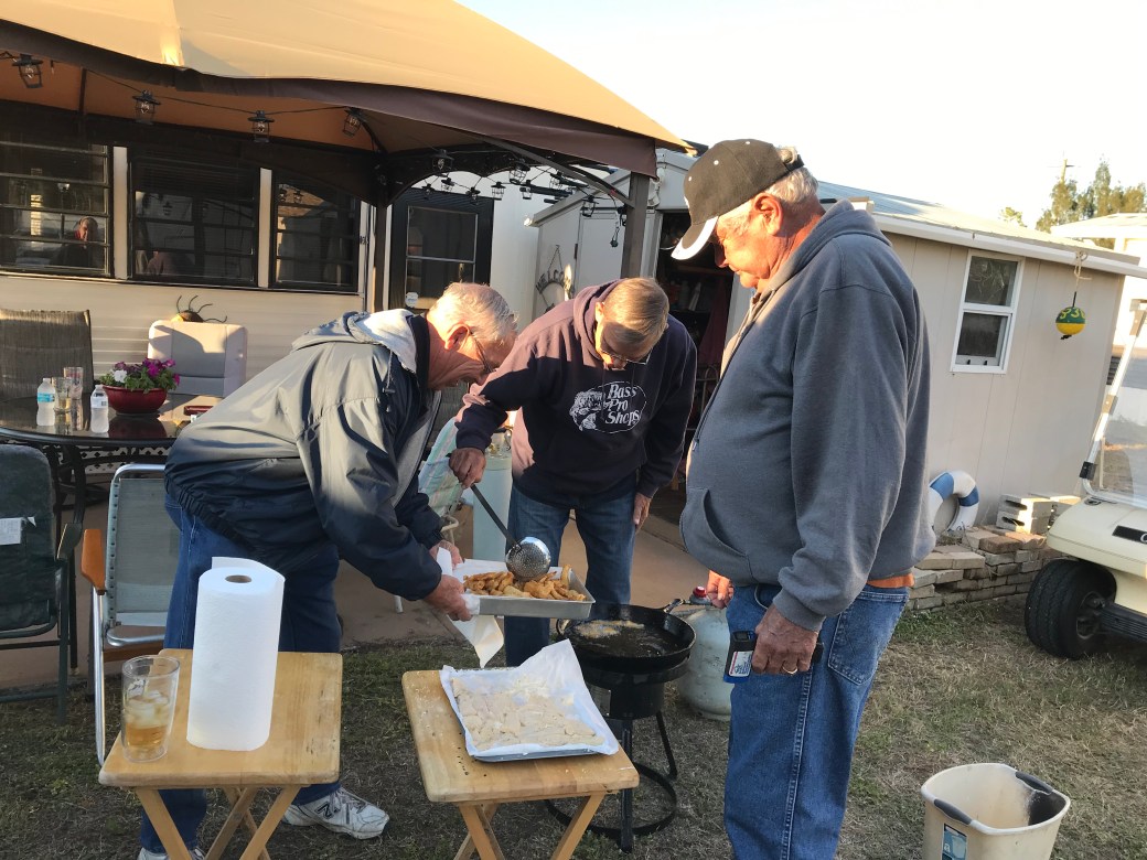 Jim, Frank, and Dale cooking up some delicious walleye. Thanks for the going away party!