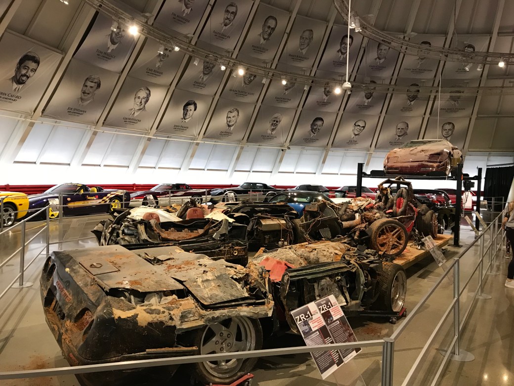 The yellow line is the cave, the red line was the sinkhole. The overall size of the hole was 65’ by 45’ and over 30’ deep. Eight corvettes were swallowed up in the sink hole, three were repaired and all of the cars are placed in the appropriate area they had been in prior to the collapse.